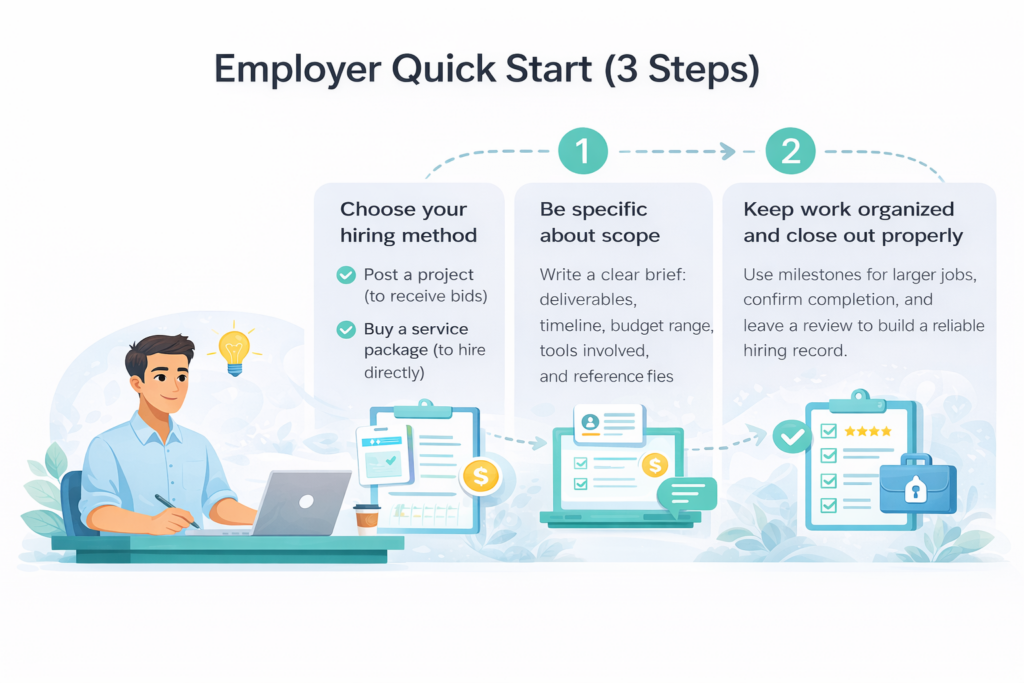 - For Employers: Explore a wide range of freelancer services or post your project as a job fixed-price, milestone-based, hourly, or custom.